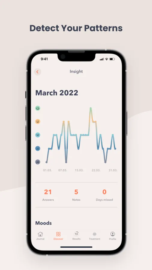 As an option, Apple Health data can be linked to the app to detect patterns and relationships between your emotional well-being and mood.