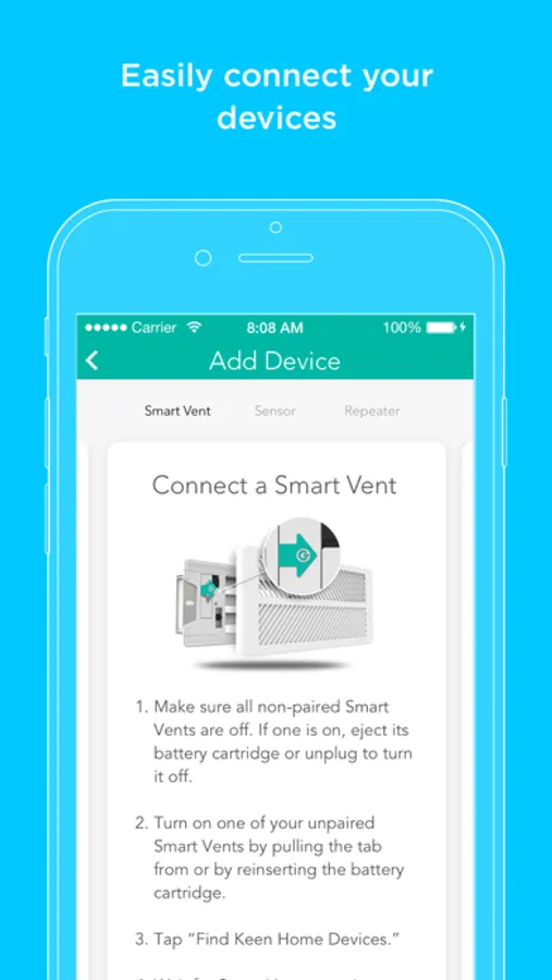 Easily connect your Smart Vents, Smart Bridge, and Temp Sensors in the app with quick access to tutorial videos and troubleshooting help.