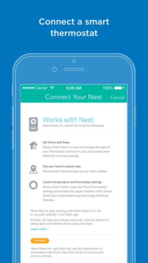 Keen Home Smart Vents integrate with the Nest Learning Thermostats, ecobee3 and ecobee4 thermostats, and new integrations are added regularly. Use the Keen Home app to connect to a Nest or ecobee thermostat, and to any number of future integrations. With the Nest and ecobee integration, you can control your smart thermostat right from the Keen Home app. Expect updates and new features over time.