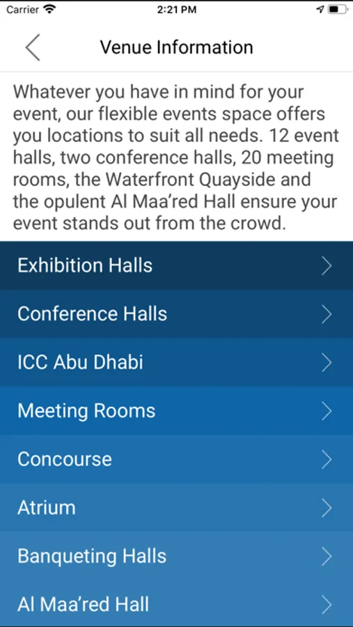 What’s On - Users can view all of the upcoming events at ADNEC; they can view By Date or By Category, or search for a specific word. It offers the user the ability to add the event date to the iPhone calendar with a reminder notification.