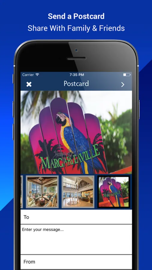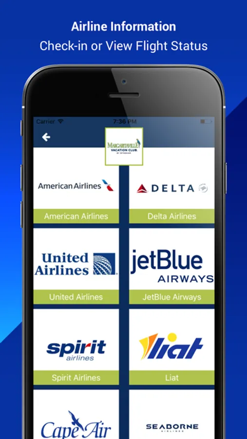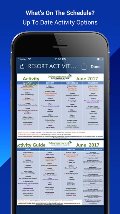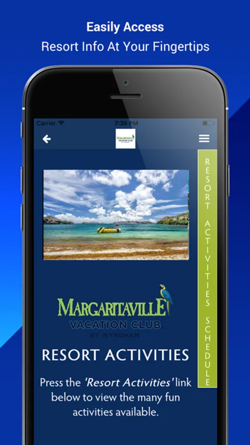 The Margaritaville Vacation Club virtual concierge mobile iPhone app includes: