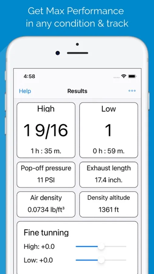 - Results: In this tab, a recommended jetting and exhaust length setup are shown. These data are calculated depending on the weather conditions and the engine and track configuration given in the following tabs. The following values are given: high needle, low needle, pop-off pressure and exhaust length. Besides this information, the air density and density altitude are shown too. In addition, this tab lets do a fine tunning adjustment for the high and low needles to adapt to the concrete engine.