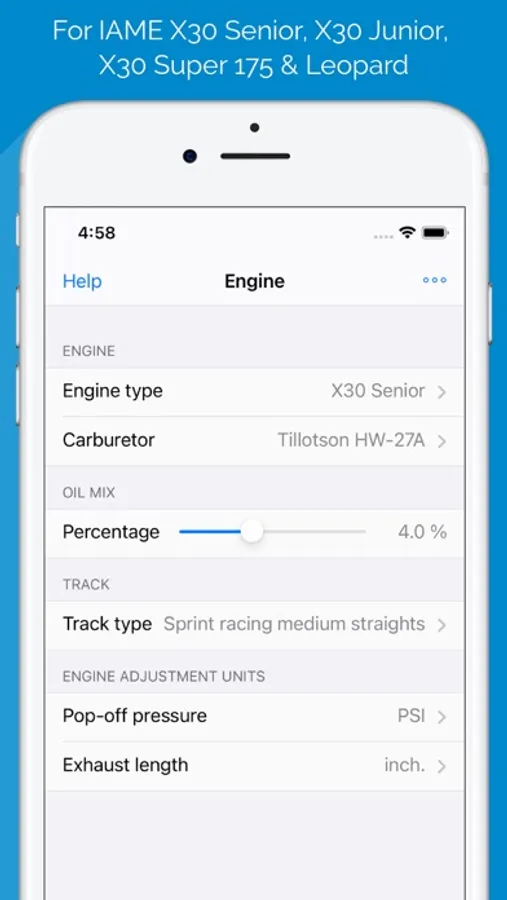- Engine: You must set in this screen the information about the engine, that is, the engine type (Leopard, X30 Senior, X30 Junior X30 Super), carburetor, exhaust restrictions (for Junior engines), the oil mix ratio and the type of the circuit (short or long tracks). Depending of the track type, the jetting setups will be adapted.