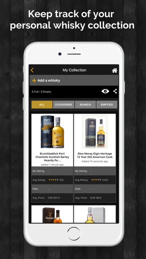 Save your favourite whiskies, rate them, share your ratings and new finds on social media and create public or private tasting notes.