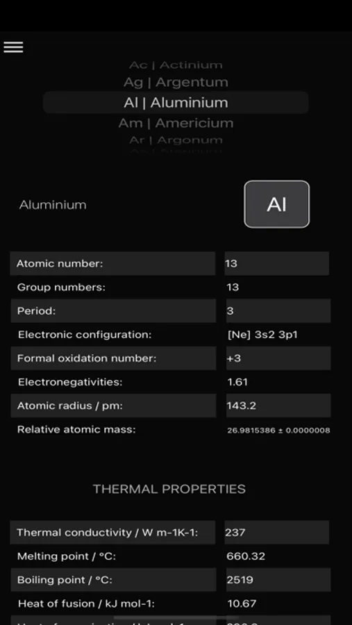 You also have the whole periodic table elements with specification inside. You can convert between different units and also learn about all chemistry signs.