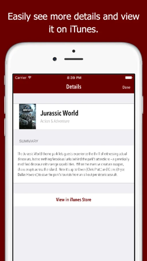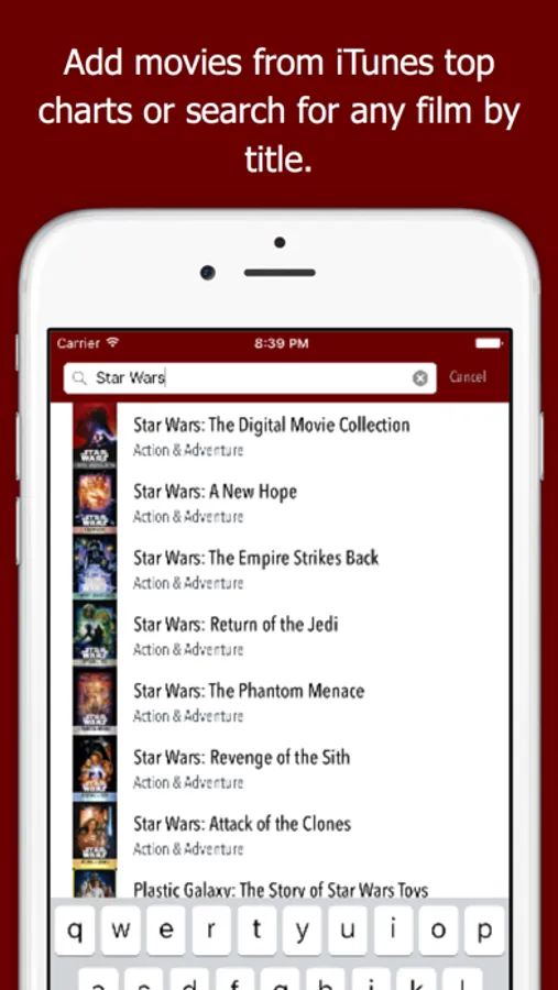 * Browse through movie cards, swipe up on the ones you like and watch as they magically fly from your phone to your Apple TV screen.