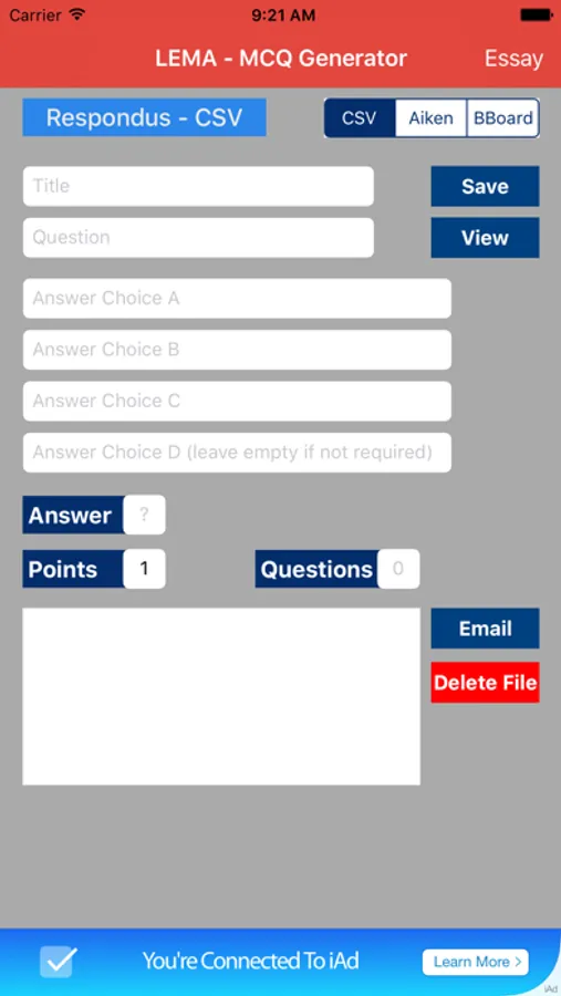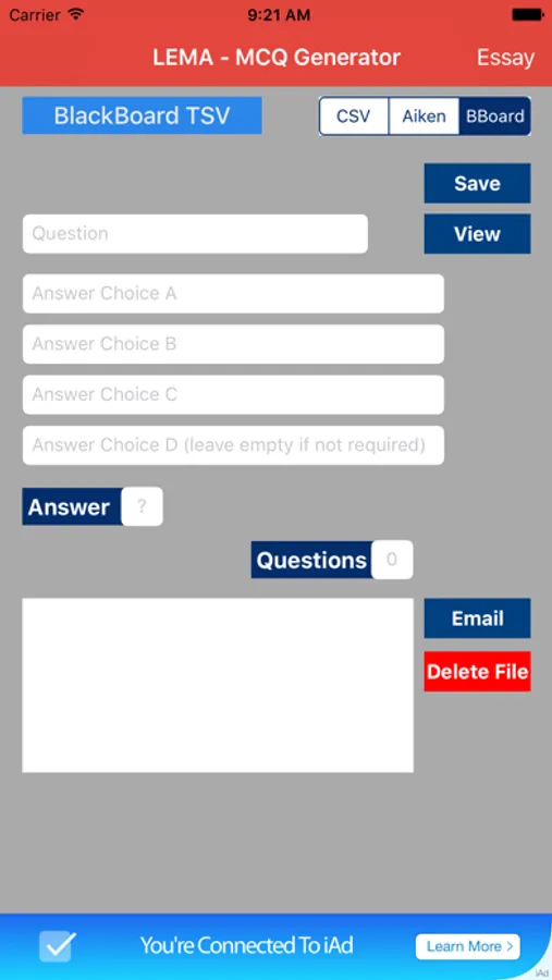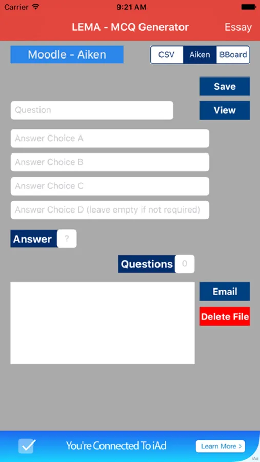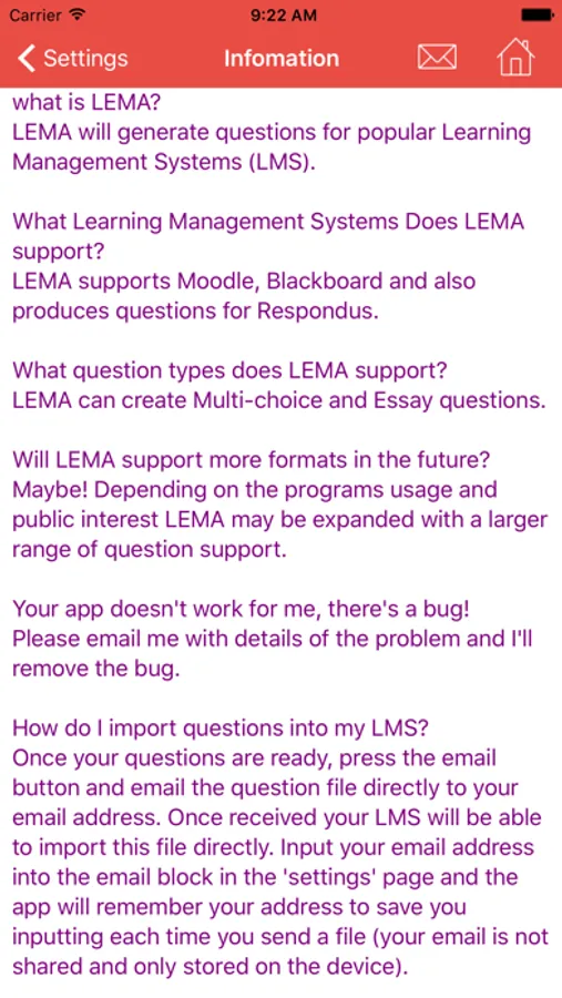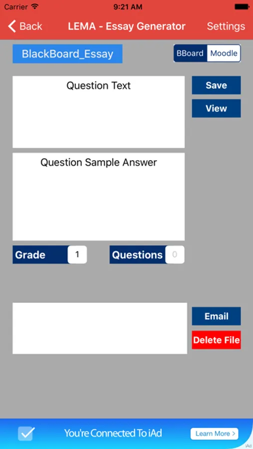 LEMA is a support App for generating questions for popular Learning Management Systems (LMS) like Moodle, Blackboard and can also generate questions for Respondus. LEMA supports multi-choice and essay questions with the ability to email the file to an email address so the user can import into their favourite LMS.