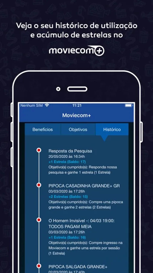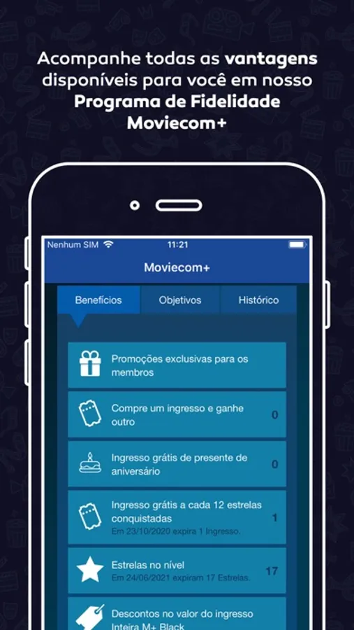 Ao baixar o aplicativo Moviecom e se cadastrar, você pode virar um membro do Moviecom+: ganha 1 estrela para cada sessão que assistir e pode ainda ganhar estrelas extras através de promoções que acontecem todas as semanas.