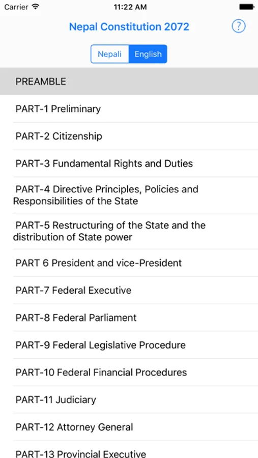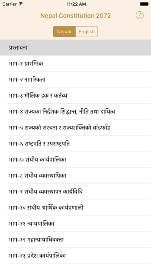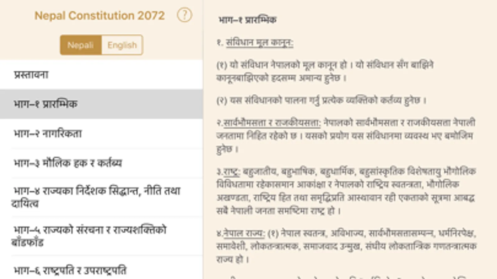 The country of Nepal is now governed by the New Constitution of Nepal (Nepal Constitution 2015) which came into effect September 20th, 2015, replacing the interim Constitution 2007. This is the best & the easiest application for reading the New Nepali Constitution in both Nepali and English. We have worked very hard to build this beautiful reading app with all the best design practices. Our app will allow you to read the constitution in either 100% Nepali or can be switched to 100% English for the best experience.