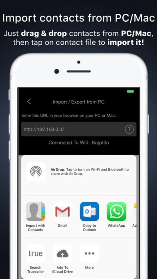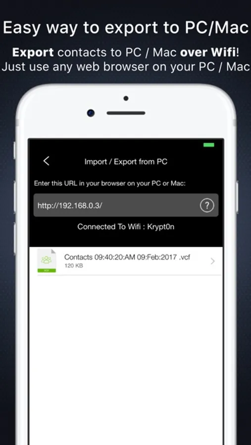 3. Export all contacts directly to your PC / Mac over Wifi, no software needed!