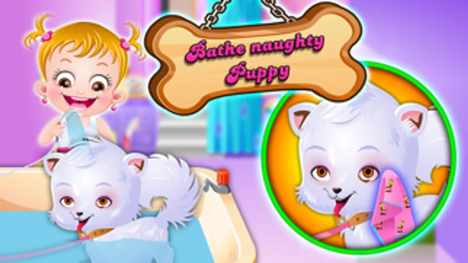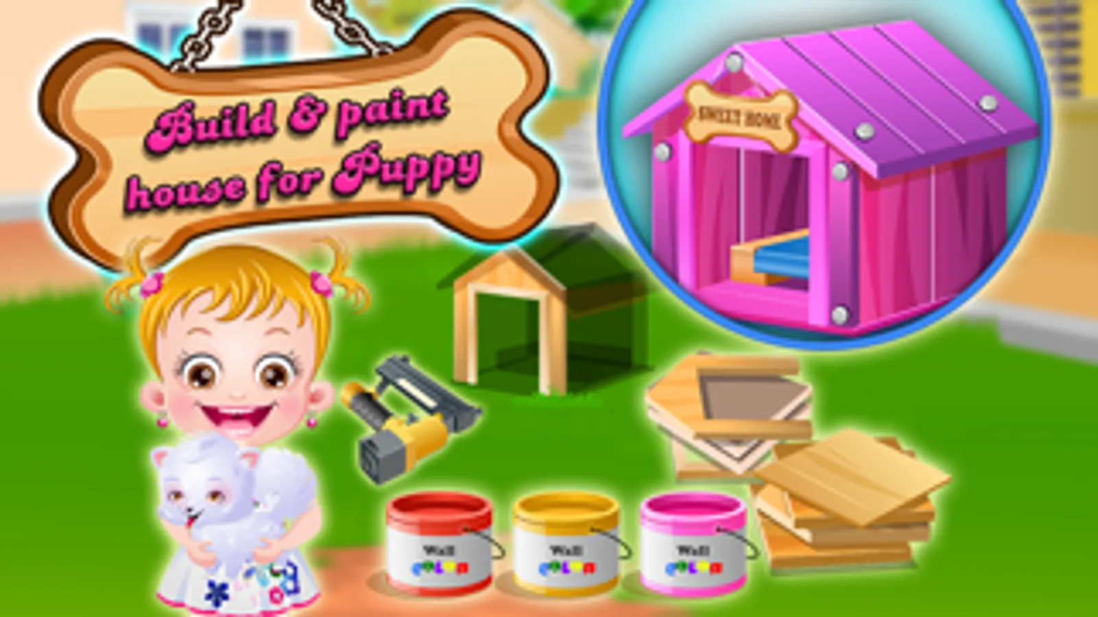 Baby Hazel adores her pet puppy, Bruno a lot. Little Bruno is too naughty and cute to be looked after. Have fun feeding and bathing naughty Bruno. Join Hazel to pamper Bruno and surprise him by making a beautiful doghouse for him.
