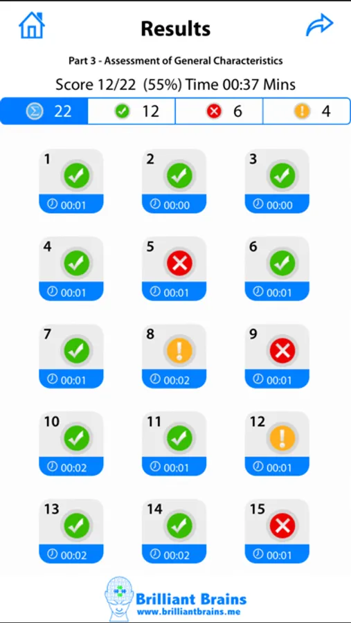 A summary of the practice test is presented at the end of each test. It shows you the time you took, the score, which questions you answered correctly and where you were wrong. And yes, you can E-MAIL the results.