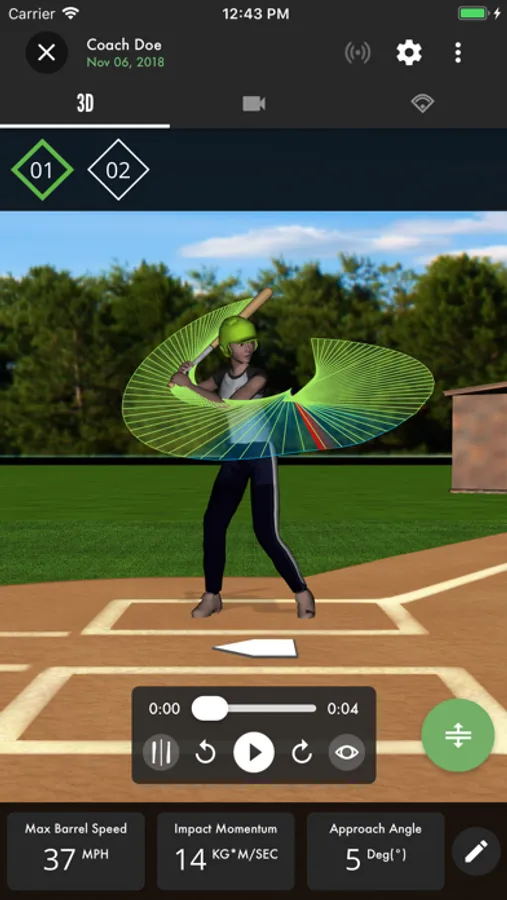 Watch the bat’s path using the unique 3D Viewer that shows bat and hand speed throughout the swing, impact and bat distance in the hitting zone. Using Video & Data Sync, pinpoint what every part of the body is doing during each step of the swing