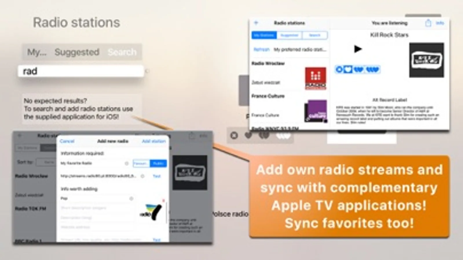 Radio on TV is a simplistic internet radio player designed to work together with Apple TV application. But it works very well as a standalone program, too. Bundled together with iOS apps that make adding own radio station to sync with your TV a breeze. Add your own stations and share with others!