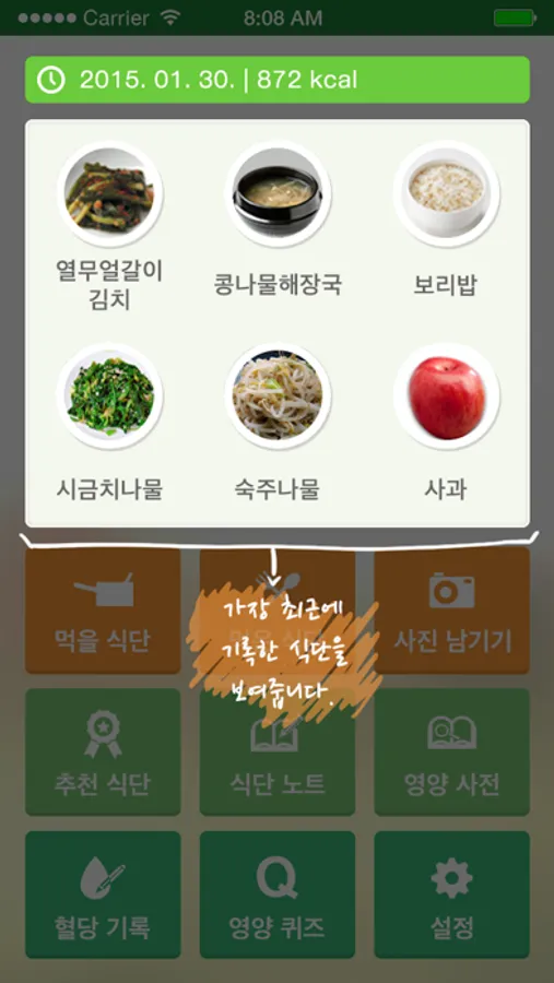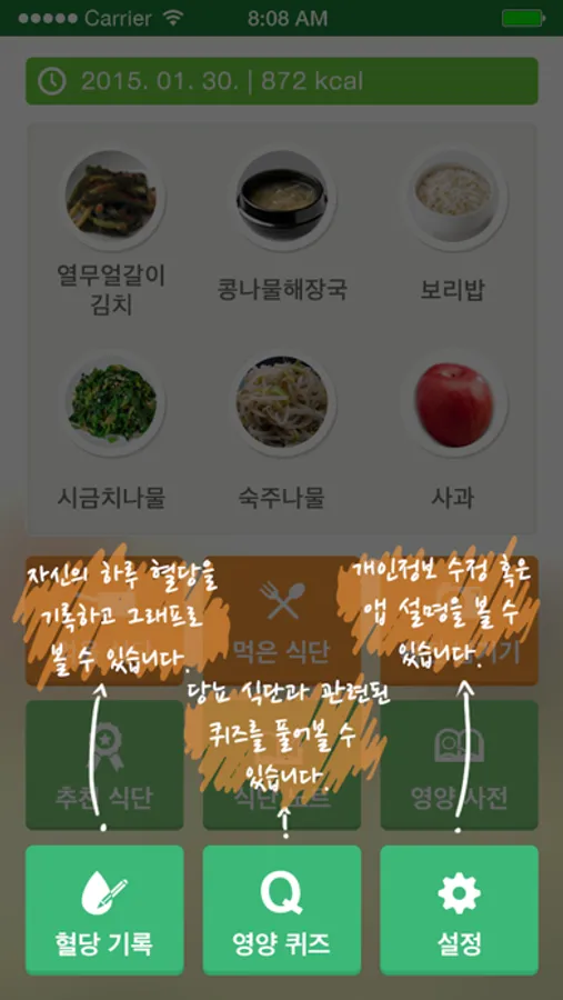 섭취한 식사를 기록해봄으로써 문제되는 식사에 대한 평가와 적절한 식사 가이드를 제공받게 되고, 계절별 대표 추천 식단을 통해 쉽게 식사를 계획해 볼 수 있습니다. 그 밖에 혈당 수치를 기록하면 그래프로 보여줌으로써 식사와 혈당의 패턴을 관찰하고 당뇨병 자가관리를 잘 할 수 있도록 도와줍니다.