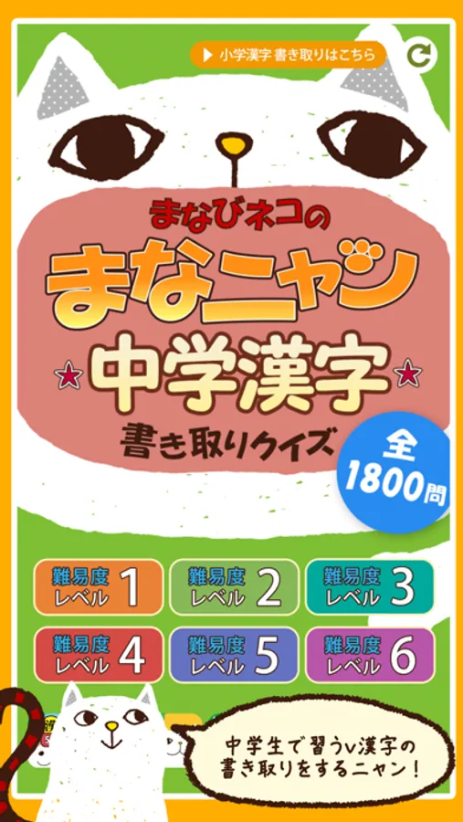 「中学漢字 書き取りクイズ」は、楽しく漢字を書けるようになるパズルゲームです。まなニャンのおなかに漢字を書こう。正しい漢字を書けたら、まなニャンも大満足!