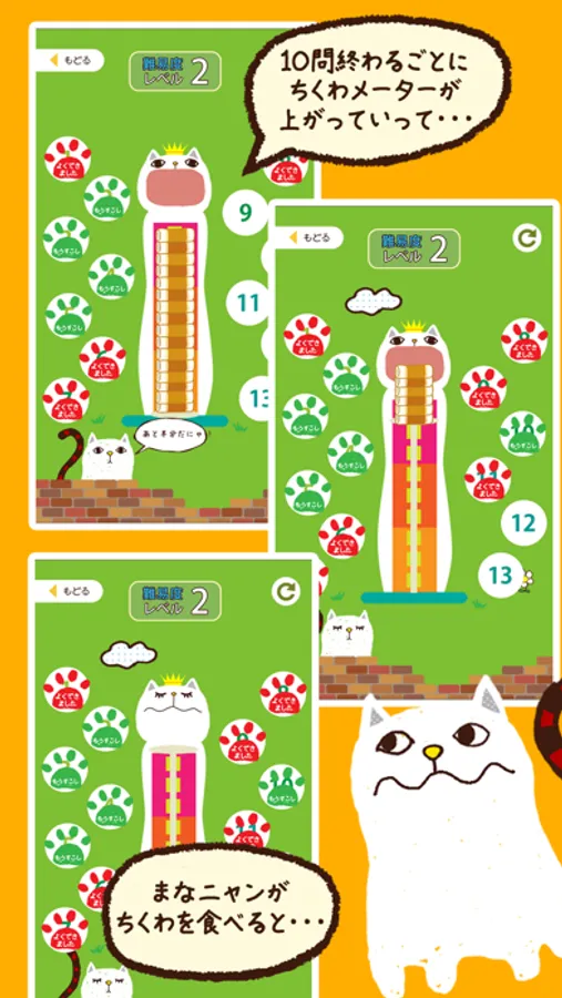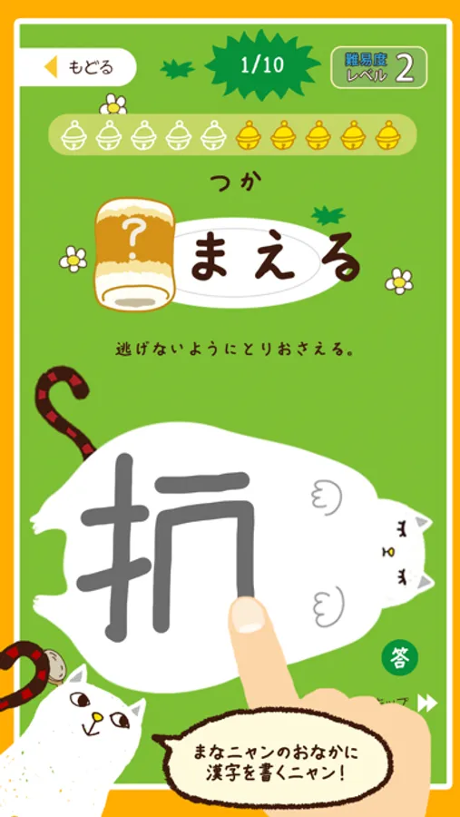 メニューは難易度ごとに分かれていて、1回につき10問を出題。1問ずつ出される漢字を、まなニャンのおなかに書いていきます。正解の場合はまなニャンがちくわを食べることができて満足、不正解の場合はちょっと不機嫌です。1問につき10秒の持ち時間内で答えましょう。時間は並んだ鈴が知らせてくれます。
