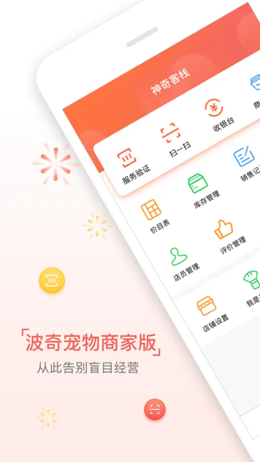 波奇宠物商家版是一款宠物店管理系统,主要功能包括商家服务凭证码验证,管理商品信息/库存、回复顾客评价、采购商品、查看经营数据、维护会员/店员信息。