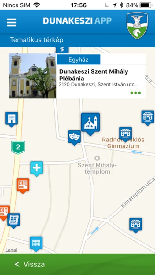 Az applikációból elérhető a város összes intézménye, kapcsolati adatokkal, és térképi elhelyezkedéssel.