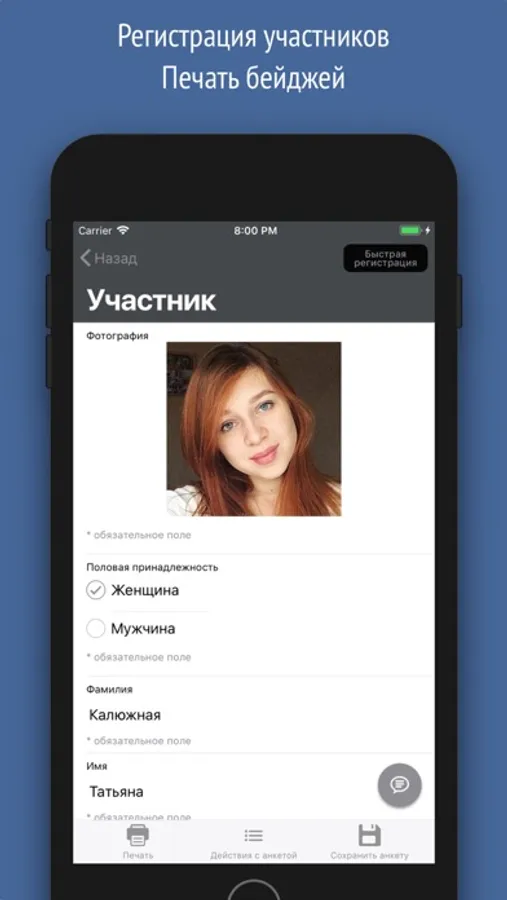 • Регистрация новых участников с возможностью фотографирования камерой мобильного устройства.