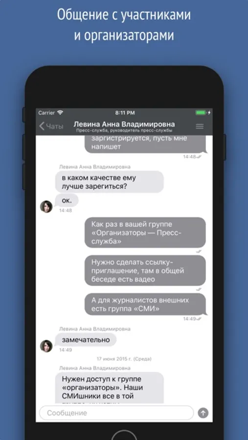 • Общение, обмен мгновенными сообщениями, с организаторами и другими участниками мероприятия.