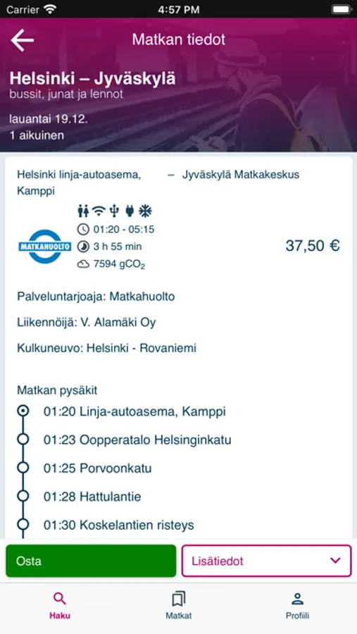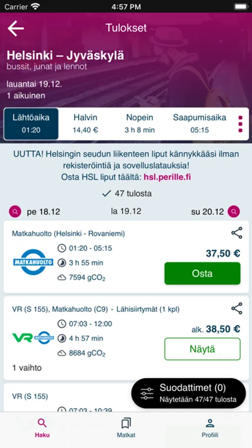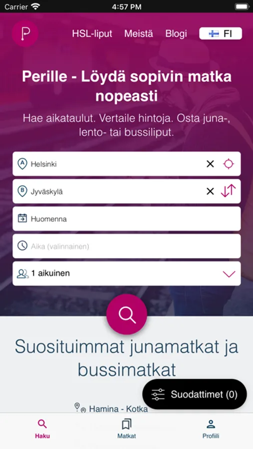Travel easy! Perille is a route planner that makes planning your trip and buying tickets quick and easy. Perille app finds the best route and means of tranportation from long-haul options in Finland and commuter options within large cities. Choosing the most suitable option is easy with Perille - it helps you compare buses, trains, and taxi prices, travel times, the duration of travel and the environmental impact of the way of travelling. Alternatives can also be compared to your car. Happy Travels!