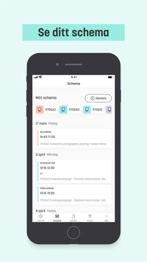 - Söka efter kurser och filtrera på relevanta undervisningsmoment och lägga till dem i ditt schema.