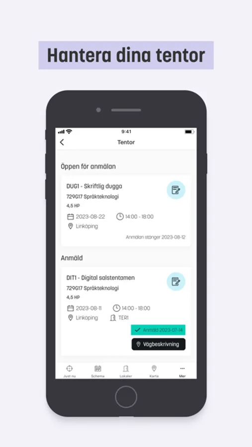 - Anmäla dig till dina tentor och se när och var nästa tenta äger rum.