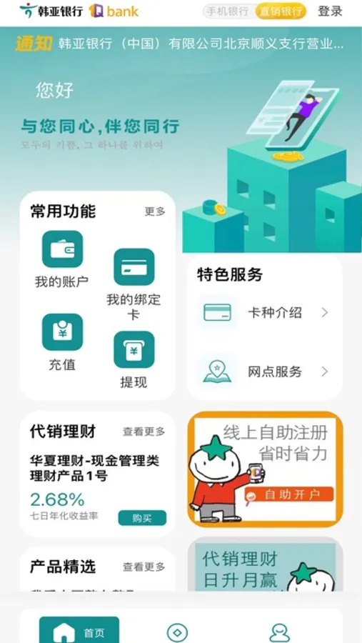 通过一个App将直销银行、手机银行完美地结合在一起,您只需滑动屏幕就可以完成切换。