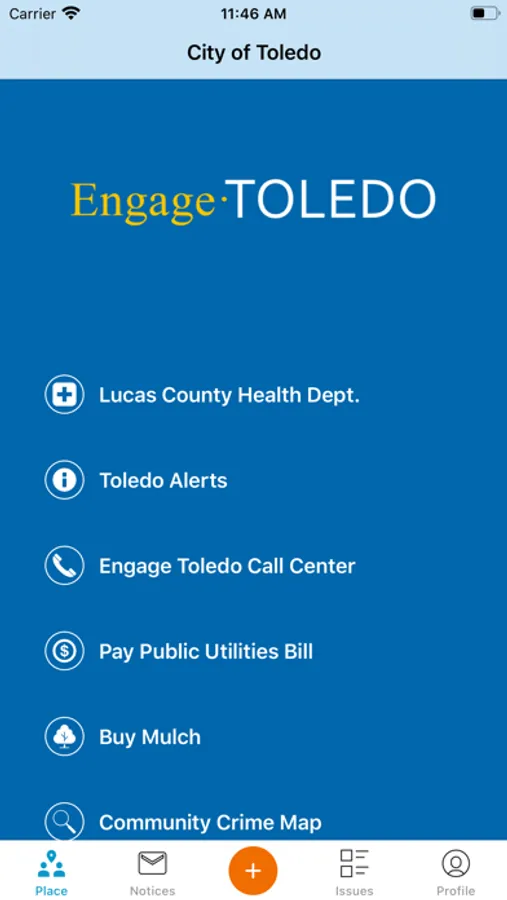 For potholes, service requests, code violations, city information, community programs, damaged street signs, and more, the Engage Toledo mobile app makes contacting the City of Toledo, OH, easier than ever! This mobile app uses GPS to recognize your location and gives you a menu of items to select from. It also allows you to upload pictures or videos with your selection. In addition, the mobile app can be used to track the status of items submitted to Engage Toledo and you can follow items until they are resolved.