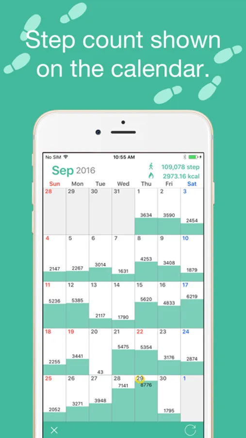 The app also features a monthly calendar screen with a day-by-day visual chart of steps walked, allowing you to check your steps counted along with your exercise routine.