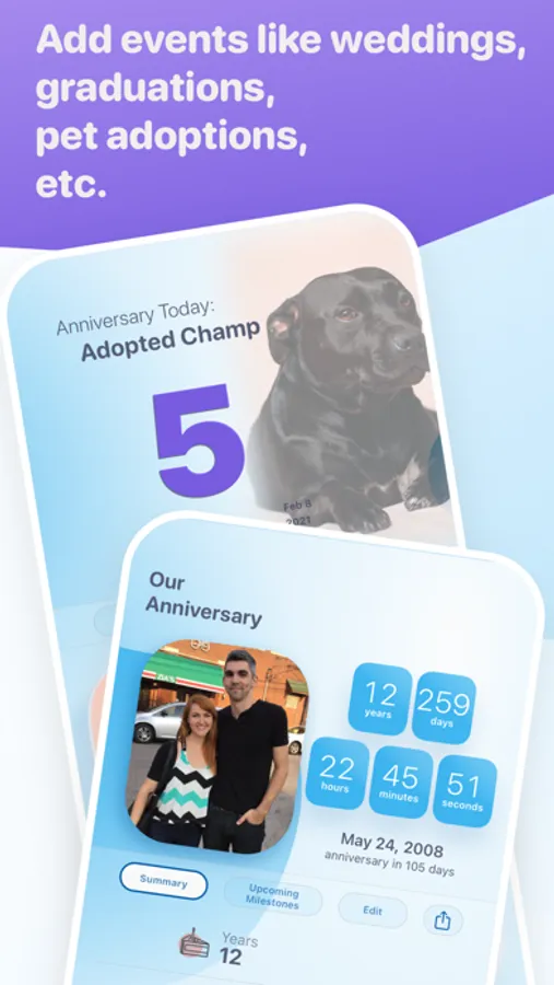 Celebrate Milestones. Years, months, weeks, days, hours, minutes, and seconds. Celebrate milestones like the millionth second of a wedding anniversary, the 1,000th day since a pet adoption, or the 10,000th hour of a child’s life.