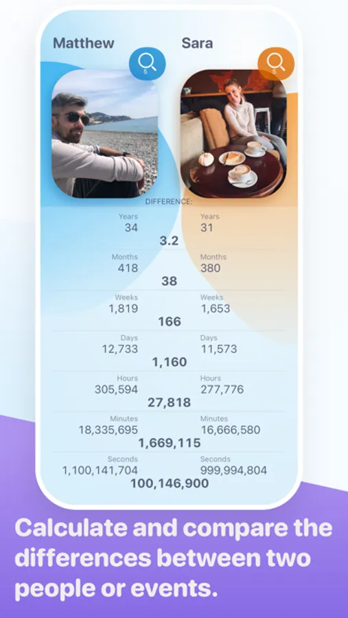 Compare and Contrast. Track the time between two people or events down to the second.