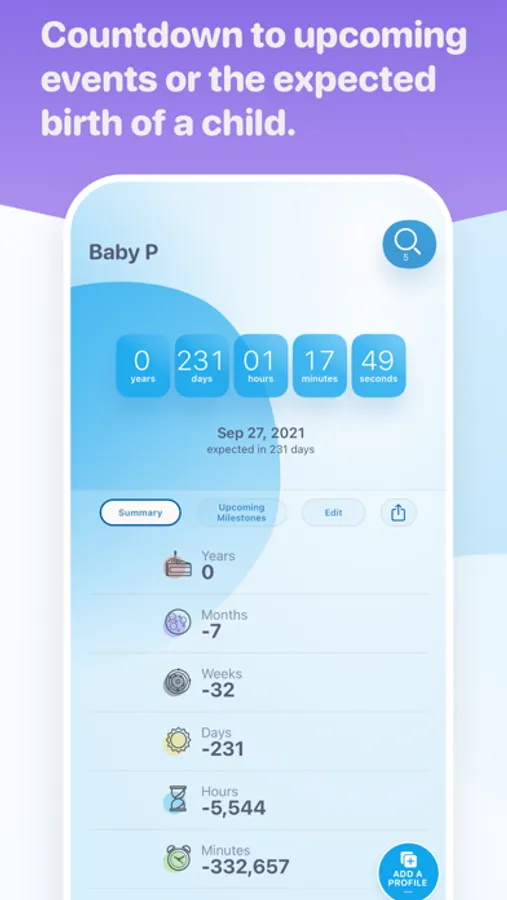 Future Event Countdown. Add an event in the future, or the expected birthdate of a child, and countdown the days remaining.