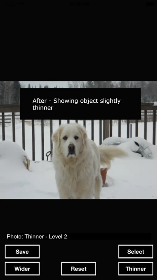 Unlike other apps which alter the entire image and make it look fake, this app will only alter the object in the center of your photo, making it appear thinner while keeping the rest of the photo normal looking. You have multiple level adjustments that you can make thinner or thicker so you can adjust the photo exactly the way you want it to look. Tap the save button when done to save your new photo.