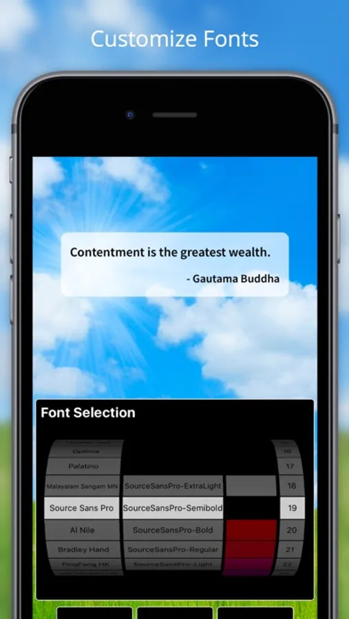 • Tons of ways to customize your experience including: changing the image; adding your own images; changing the font, font color and font size; choosing different sounds, repositioning the quote box to your liking before sharing, changing text drop shadow and background transparency.