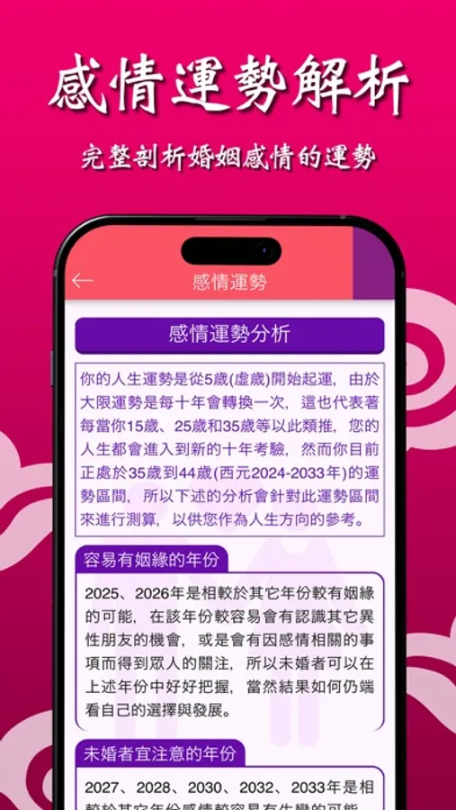 針對感情運勢做更細膩的解說,難道感情對待只能從「夫妻宮」來看嗎?在本服務中會分析您先天的感情觀、還有情侶最想知道的「給你伴侶看的秘密」單元,在這單元中將會解密您的伴侶心中所在乎或在意的點,透過了解彼此心中所在乎的有助於雙方的溝通,此外本服務也提供感情運勢的分析,針對「容易有姻緣的年份」讓你可以知道在哪一年份應該要好好把握哦!