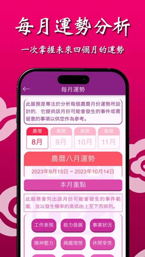 每月運勢是採用「飛星四化」的飛化法則來針對您四個月內的「事件重點」以及「特殊事件」作分析,讓您可以預先掌握未來所要面臨的挑戰與考驗,此外該服務目前【限時特惠】只要【付費一次】即可永久體驗每四個月的運勢分析,要搶要快!