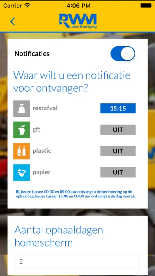 Als u notificaties (herinneringen) gebruikt, heeft u de keuze uit verschillende tijdstippen. Op deze manier ontzorgt de App u volledig ten aanzien van alle ophaalmomenten van de verschillende afvalstromen.