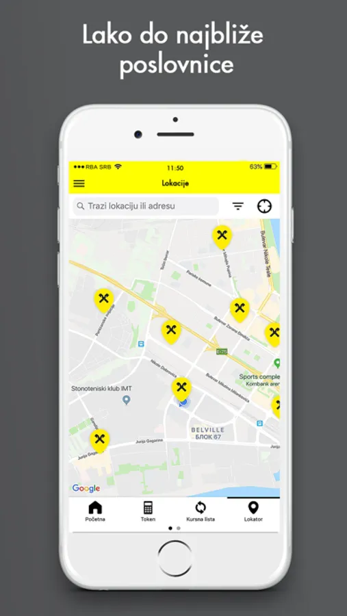 - Lokacije na mapi sa informacijama o adresi i radnom vremenu filijala i bankomata