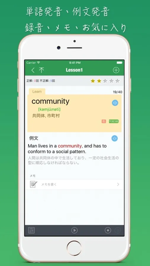 ・録音機能:単語を勉強する時に、録音ボタンを押すと、録音モードに入ります、ここで自分の発音や音声メモーを記録することができます。