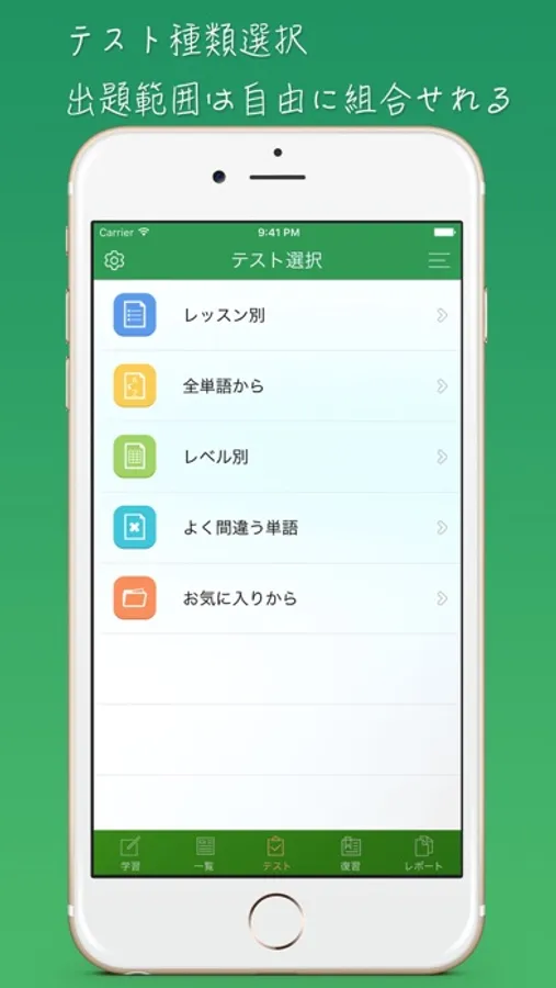 ・よく間違う単語:1回、1〜3回、3〜5回、5〜10回、10回以上などの間違えた回数によりテスト範囲を選択;