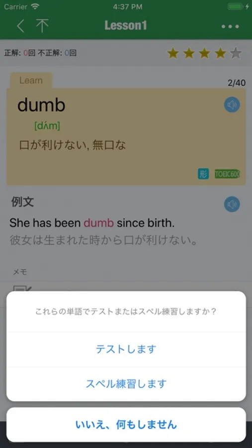 テストの最中に一時停止、リトライ及びお気に入りチエック機能が付き、間違った単語のみを再テストすることもできます。