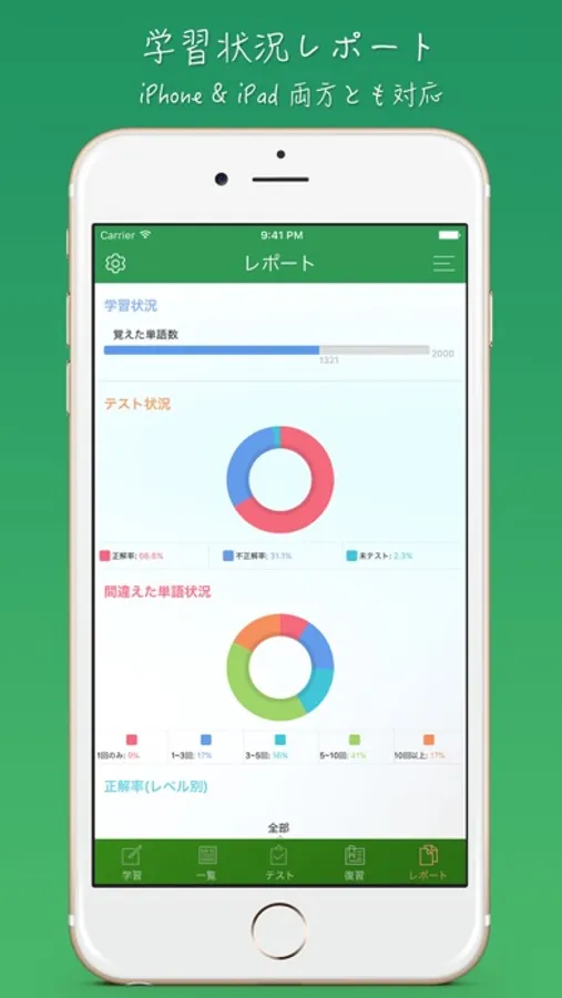 ・レベル別の正解率もチャートで表示され、学習効果を多方面でわかるようなっています。