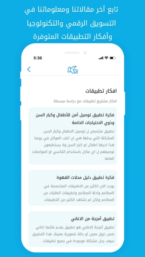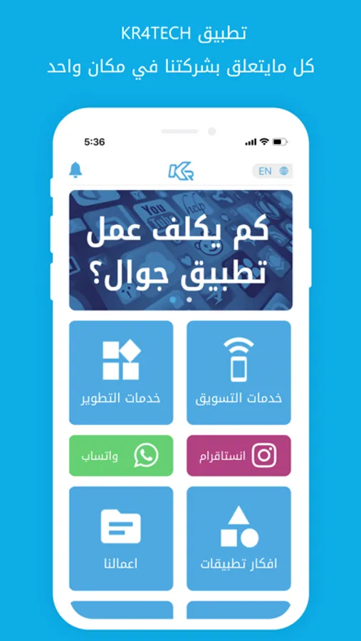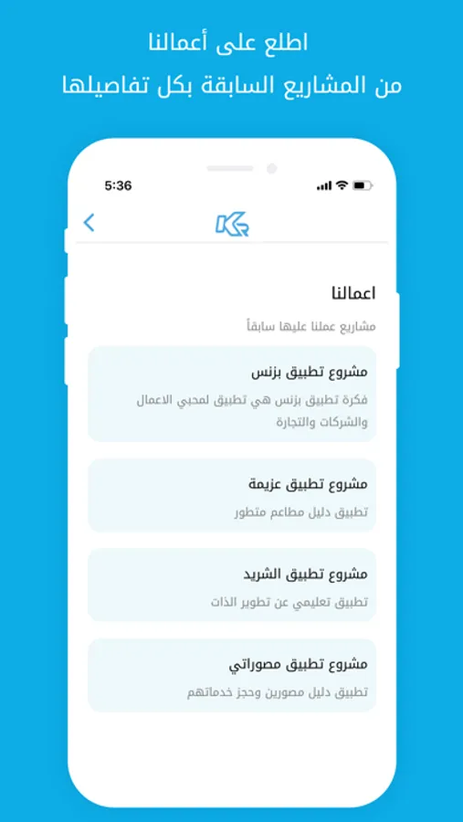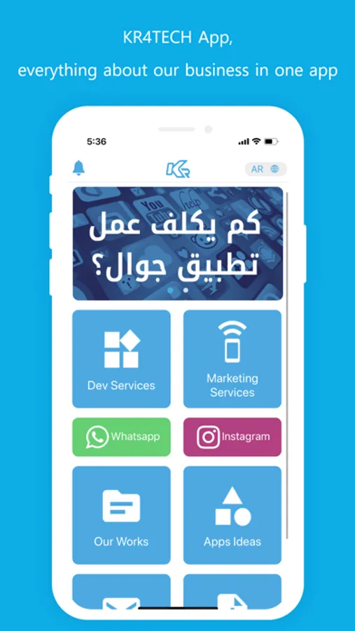 التطبيق الرسمي لشركة كي ار ٤ تيك، نحن وكالة تسويق رقمي ونقدم خدماتنا لنوفر لكم تجربة جديدة في مجال تصميم المواقع والتطبيقات الذكية والتسويق الرقمي وهذا مانحبه