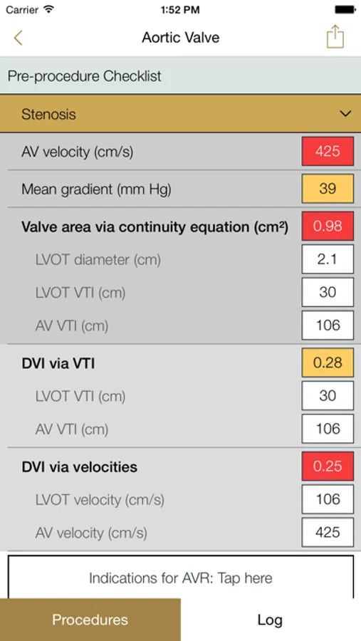 This app is organized by procedures. If you're starting an aortic valve replacement surgery, open the aortic valve section and start inputing values to assess the severity of the aortic valve pathology. These values can be used to calculate valve area and even troubleshoot replacement valves. Levels of evidence based off of publications from Journal of American Society of Echocardiography (JASE) and American Heart Association (AHA), are listed within the app.