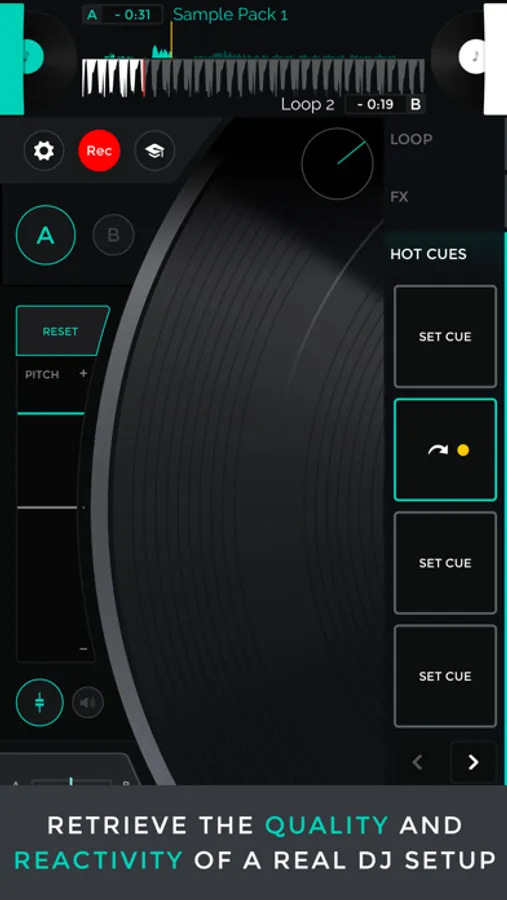 - all the essential tools a click-away: pitch know, volume fader, hot cues, audio FX