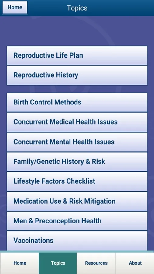 The Preconception Care mobile application (app) was developed by the Department of Veterans Affairs (VA) and provides VA and non-VA care team members with information that supports the integration of preconception care into comprehensive primary care, thereby optimizing the health of women Veterans and their children.