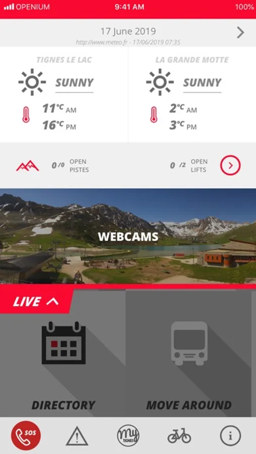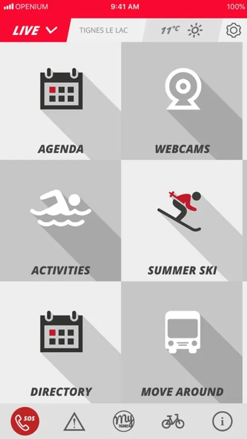 - In winter: Powder alarm, skier bulletin, slope info, ski lifts, road traffic alert, weather forecast, agenda, resort map, ski itinerary suggestions, directory, etc.