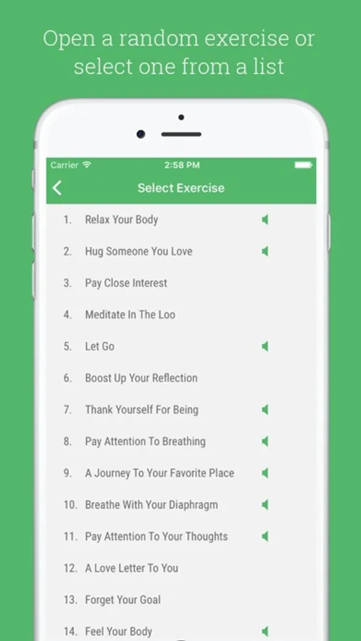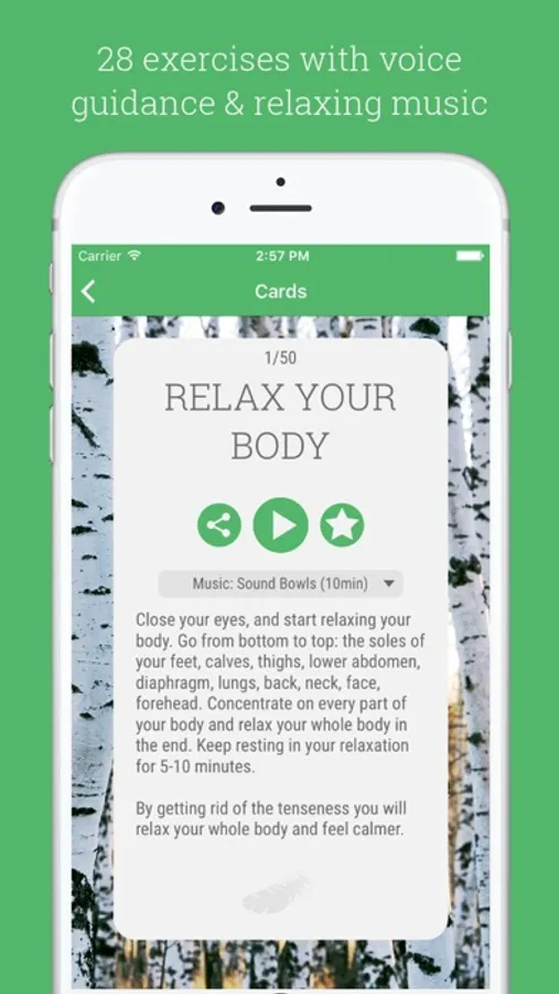 • 28 exercises with spoken guidance (guided meditation) with an option for relaxing music.